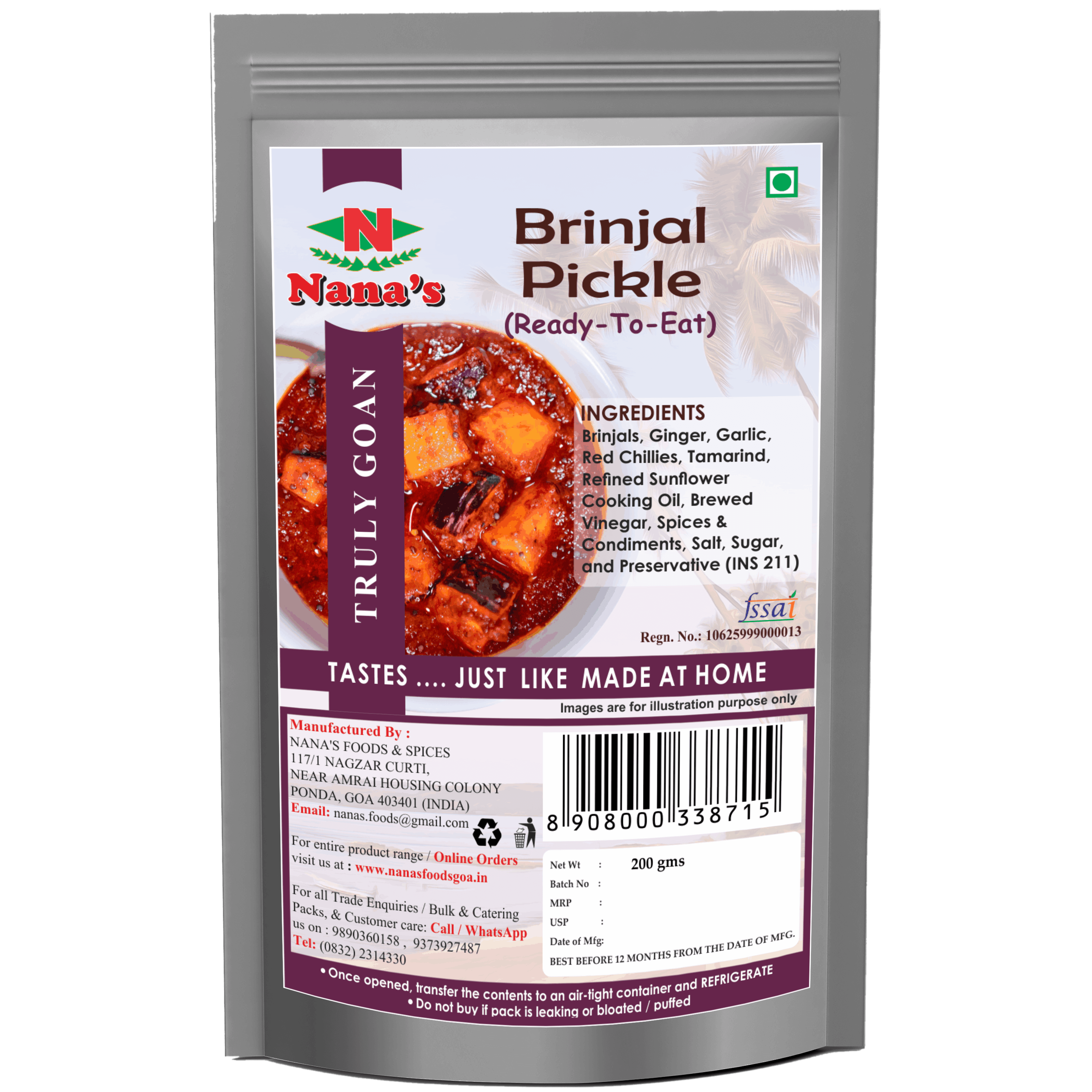 GVP-BP-200GDelight in the robust flavor of our Brinjal Pickle, meticulously crafted to tantalize your taste buds. Made from premium brinjals and a medley of aromatic spices, each jar offers a burst of tangy goodness. Whether paired with warm bread or as a zesty accompaniment to rice dishes, our pickle adds a delicious dimension to any meal. Handcrafted with care and tradition, it captures the essence of homemade goodness. With natural ingredients and expert craftsmanship, its a culinary treat youll relish with every bite. Elevate your dining experience with the exquisite taste of our Brinjal Pickle today!
