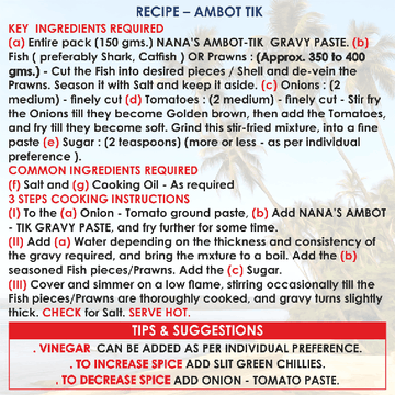 Introducing our Goan Fish Prawn Ambot-Tik Gravy Paste, a culinary marvel straight from the heart of Goa. Crafted with a blend of tangy tamarind, fiery red chilies, and aromatic spices, each jar is a flavor explosion waiting to happen. Perfect for creating the iconic Goan Ambot-Tik gravy, this paste delivers a symphony of flavors that dance on your palate with every bite. Whether you're cooking fish, prawns, or even vegetables, our paste promises to transport you to the sun-kissed shores of Goa with its authentic taste. Embrace the zest and zestiness of Goan cuisine with our Fish Prawn Ambot-Tik Gravy Paste.