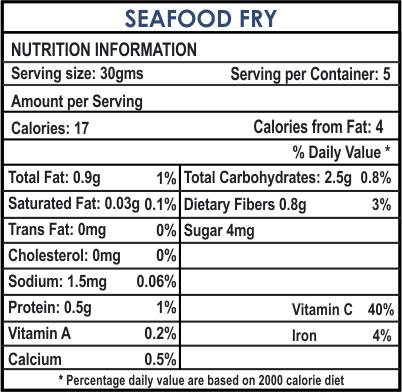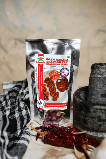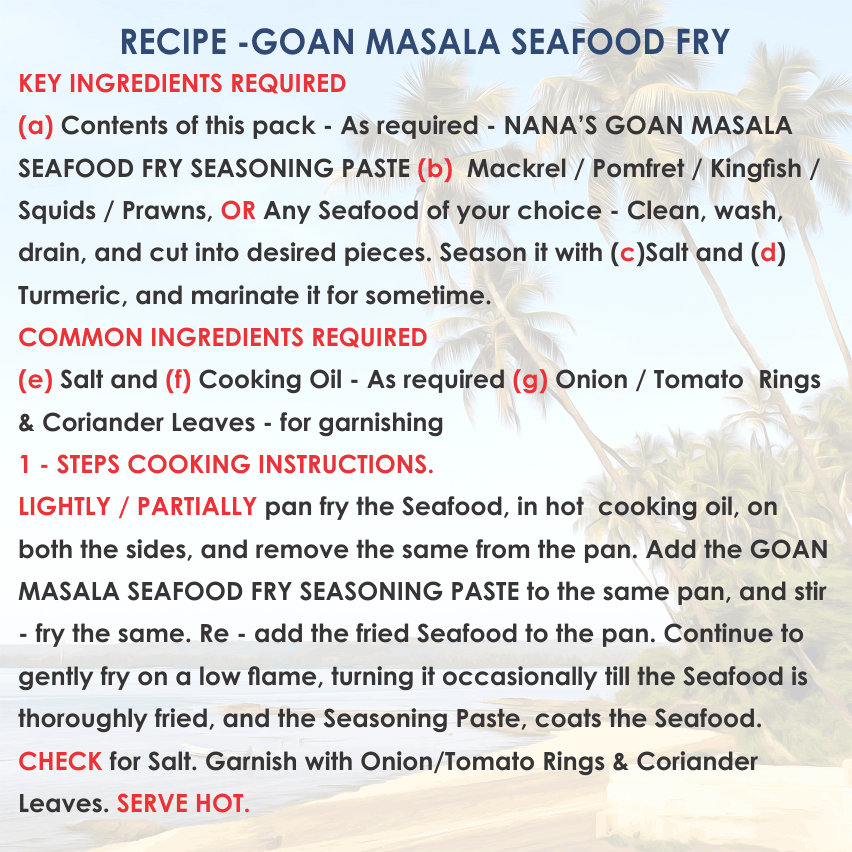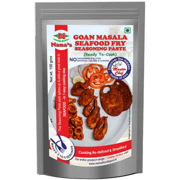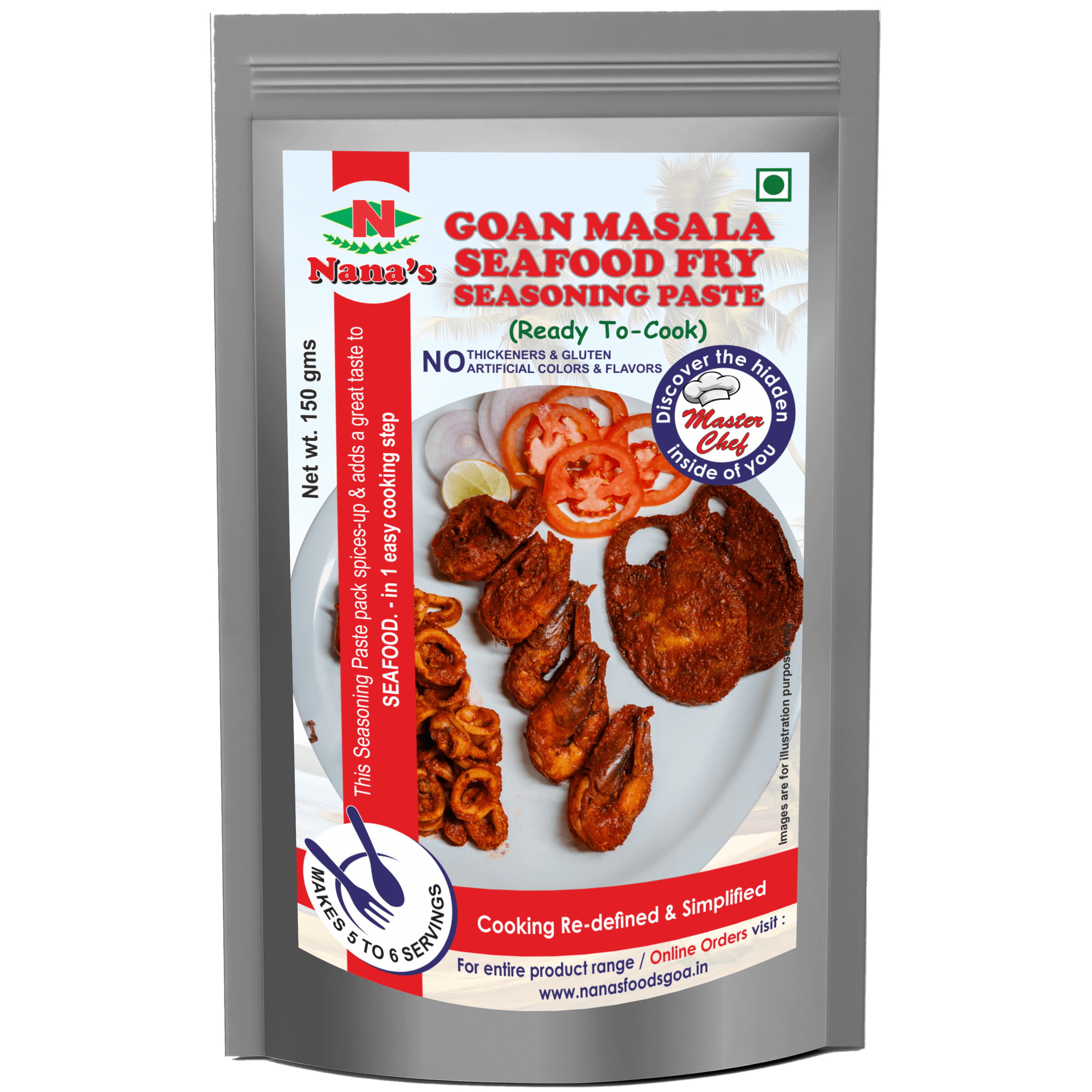 GS-GCSP-150GGoan Masala Seafood Fry Seasoning Paste is a thick and deeply coloured, tangy and sweet, flavourful preparation for pan frying seafood, such as kingfish, pomfret, prawns, squids etc. The seafood is first pan-fried and then generously coated in this rich, pungent spice paste . The result is a bold, piquant lip smacking dish with layers of flavours, giving it a crispy crust, with the flesh of the seafood remaining flaky and tender.